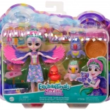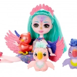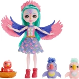 Presentiamo la bambola Filia Finch della serie Enchantimals, accompagnata dalla sua adorabile famiglia di pappagalli. Filia ha lunghi capelli turchesi e un outfit colorato che include un top e una gonna originali con uccellini. Ai piedi indossa scarpette rosa che si abbinano perfettamente alle sue eleganti ali rosa.