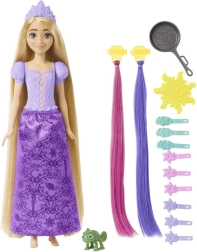 La bambola Rapunzel ispirata al film Rapunzel - L'intreccio della torre offre ore di divertimento creativo. I suoi capelli molto lunghi invitano a pettinare, intrecciare e decorare, mentre le ciocche aggiuntive cambiano colore in acqua calda – dal viola al rosa e dal rosa al blu. I bambini possono ricreare le acconciature del film o inventarne di proprie.