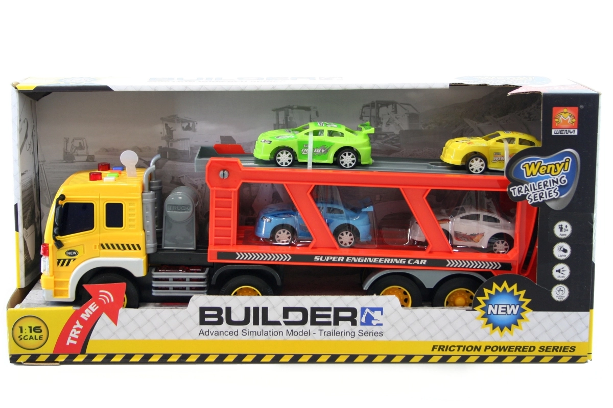 Nella confezione sono incluse 4 automobiline in plastica, facili da caricare e scaricare. Grazie alla scala 1:16 e alle dimensioni di circa 40 × 12 cm, il camion è sufficientemente robusto ma al tempo stesso facile da manovrare dalle piccole mani dei bambini.