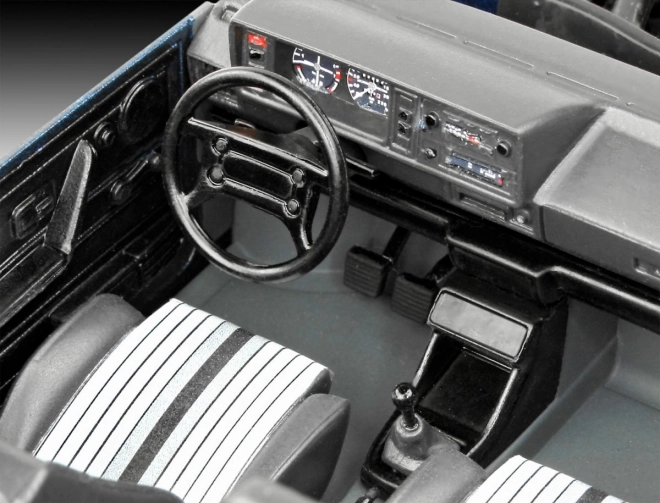 Il set include un modello dell’auto compatta tedesca VW Golf di prima generazione, 6 colori base, un pennello e colla.