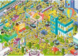Ogni pezzo del puzzle porta la gioia di assemblare e la divertente sfida di trovare il particolare smiley in un ambiente urbano vivace.