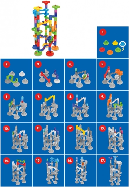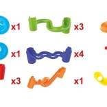 set pista per biglie con 78 pezzi! Questo set creativo permette ai bambini di costruire diverse piste per le biglie, sviluppando il pensiero logico e la motricità fine.