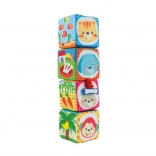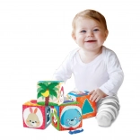 Questo set di cubi morbidi è progettato per un gioco sicuro e stimolante fin dalla prima età. Grazie alle diverse strutture dei materiali e ai colori a contrasto, sostiene lo sviluppo dei sensi, la coordinazione occhio–mano e le prime abilità cognitive. Le allegre illustrazioni di animaletti, numeri e forme geometriche motivano naturalmente i bambini all’esplorazione.