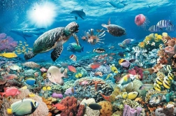 Questo puzzle rappresenta un vivace mondo sottomarino pieno di pesci colorati, tartarughe e coralli, una vera delizia visiva.
