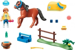 La confezione include una mini-figurina di bambino, un pony con coperta e briglie, cappello da equitazione, secchio, borsa, spazzola e altri accessori. I pezzi sono facili da lavare, resistenti e sicuri per i bambini.