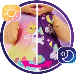 Basta girare il vestito: variante colorata per il giorno e versione più scura per la notte con motivo di coniglietti che dormono. Perfetto per giocare scenari di routine quotidiane e della buonanotte.