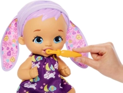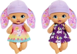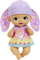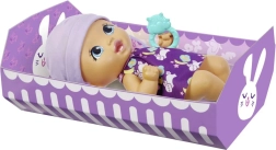 La bambola è realizzata in plastica resistente, ha grandi occhi azzurri, una bocca dolce e un cappellino lilla con orecchie da coniglio. Incluso anche un sonaglino/mordicchietto che stimola il gioco sensoriale. La confezione sostiene la sostenibilità: una volta aperta, funge da pratica culla.