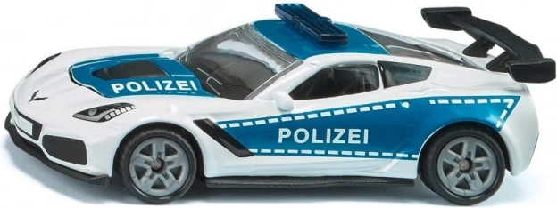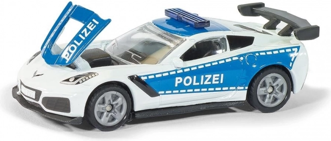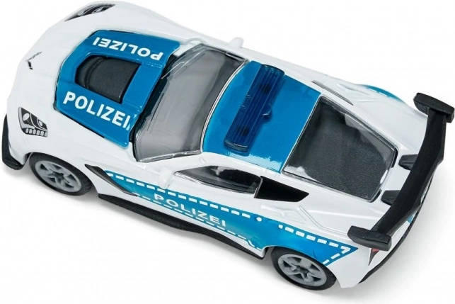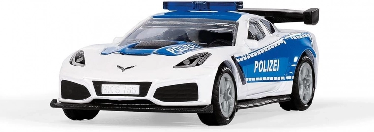 Auto della polizia CHEVROLET CORVETTE ZR1 con carrozzeria in metallo, pneumatici in gomma e cofano apribile. Modello realistico per inseguimenti d’azione.