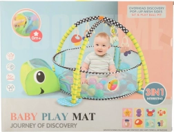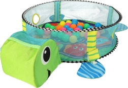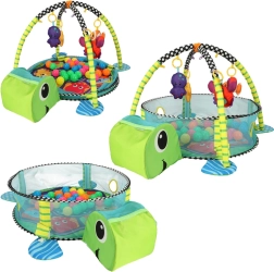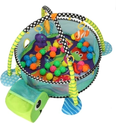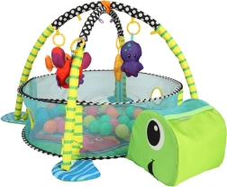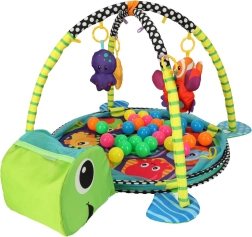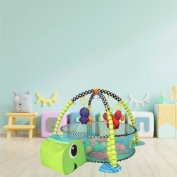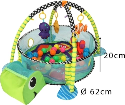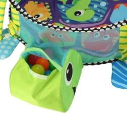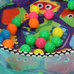- Piscina con rete: Il tappeto è dotato di una rete che, una volta aperta, crea una piscinetta ideale per giocare con palline e giochini.