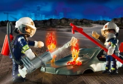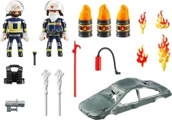 Include tutte le attrezzature di base per gli esercizi antincendio, incluse figurine di pompieri, un'auto in fiamme e gli accessori necessari.