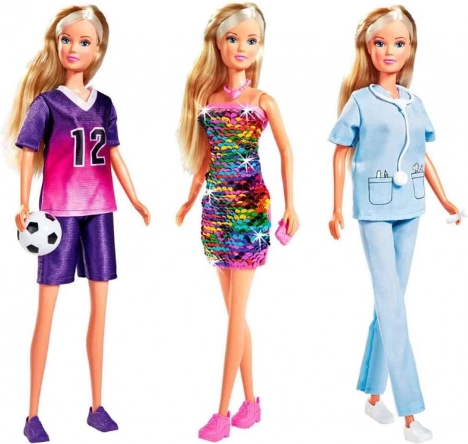 Scopri la bambola Steffi Love con tre abiti fantasiosi che offriranno infinite possibilità di gioco. Il set include una bambola con abito di paillettes SWAP che cambia colore, un abito da medico e una divisa da calcio, arricchito con accessori tematici.