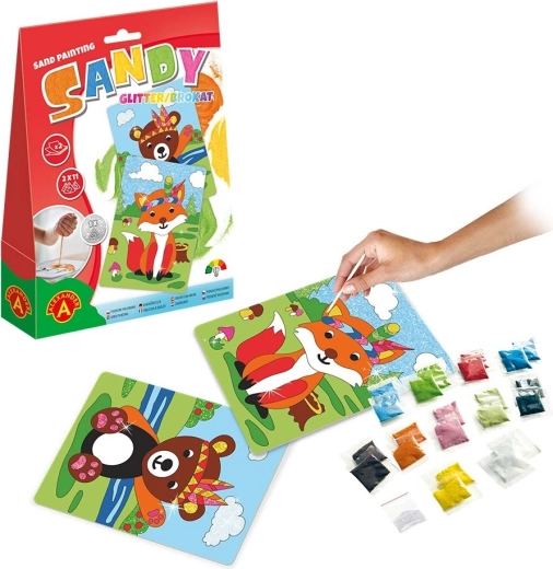 Il set di pittura con sabbia con motivi di volpe e orso entusiasmerà i piccoli artisti che amano creare immagini luminose. I bambini scoprono gradualmente le parti delle sagome autoadesive e vi cospargono sabbia colorata o broccato. Il risultato sono illustrazioni uniche e scintillanti senza bisogno di colla o forbici.