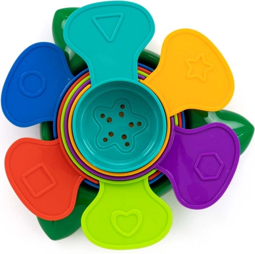 Gioco impilabile da vasca Flower di Milly Mally. 6 bicchierini colorati per impilare, costruire una torre o usare come formine per la sabbia. Ognuno ha dei fori sul fondo, quindi puoi anche versare l’acqua, setacciare la sabbia per giocare, al parco giochi o in spiaggia. I colori e le forme in rilievo sui bicchierini aiutano l’apprendimento.