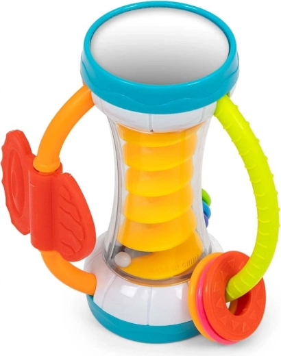 Ogni genitore ha il compito di scegliere i giusti giochi didattici per il proprio bambino. Il nostro marchio Milly Mally, con la sua gamma, sostiene proprio questo sviluppo. Presentiamo lo shaker-sonaglio che stimola la curiosità del tuo bambino. È un sonaglio e un massaggiagengive che stimola i suoi sensi, fondamentale nelle prime fasi dello sviluppo. Il giocattolo stimola il bambino, favorisce la motricità fine, cioè sviluppa movimenti controllati e precisi, compresa la mimica, e accresce la sensibilità ai suoni. All’interno della parte trasparente con spirale visibile si trovano palline colorate che, messe in movimento, producono un piacevole suono tintinnante e suscitano entusiasmo nel bambino. Sulle 3 impugnature del nostro shaker abbiamo posizionato 3 anelli colorati con texture diverse e un massaggiagengive, che aiutano il bambino a distinguere colori e forme. Allo stesso tempo il bambino riceve stimoli sensoriali e sviluppa il tatto. Le tre impugnature esercitano la presa e consentono di trasferire l’oggetto da una mano all’altra. Il massaggiagengive, posto su una di esse e realizzato in plastica piacevole al tatto con diverse texture, favorisce la dentizione. Gli specchietti alle estremità esterne dello shaker riflettono la luce e creano interessanti effetti visivi, che aiutano a sviluppare la percezione visiva e la capacità di riconoscere il proprio riflesso. Facile da tenere nelle piccole manine.