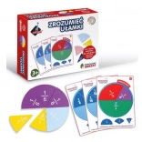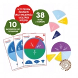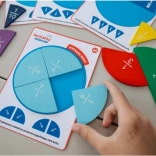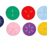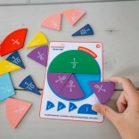 Il set include elementi in legno che rappresentano le frazioni 1/2, 1/3, 1/4, 1/5, 1/6, 1/8, 1/10; il set è completato da corrispondenti schede di lavoro.