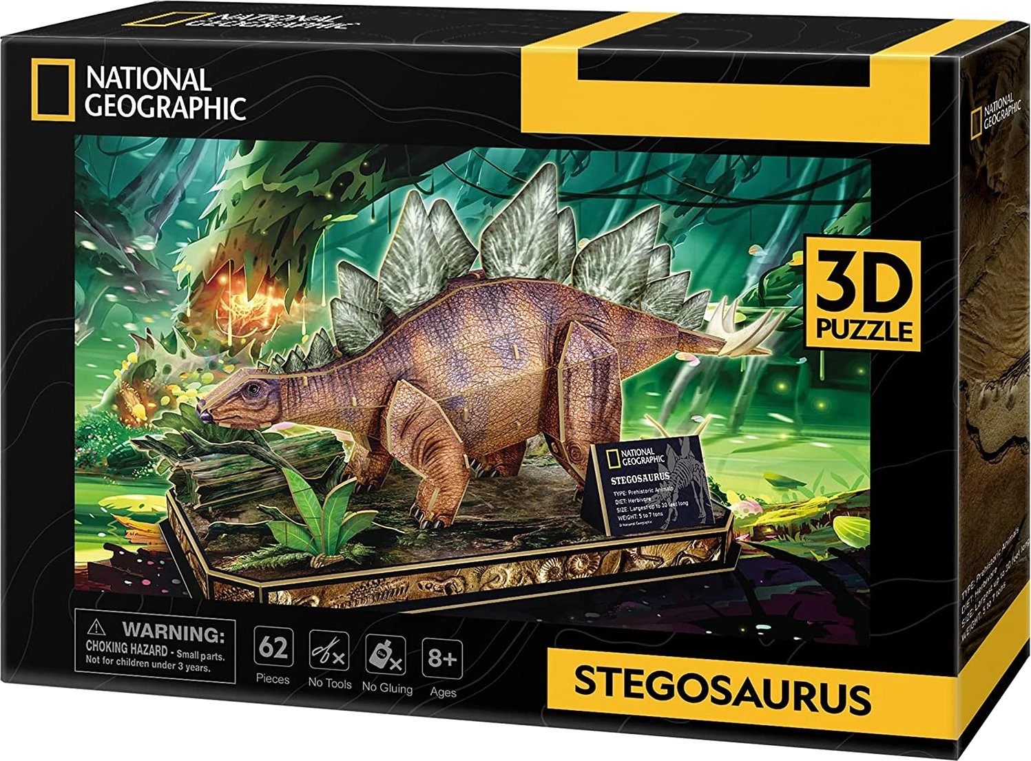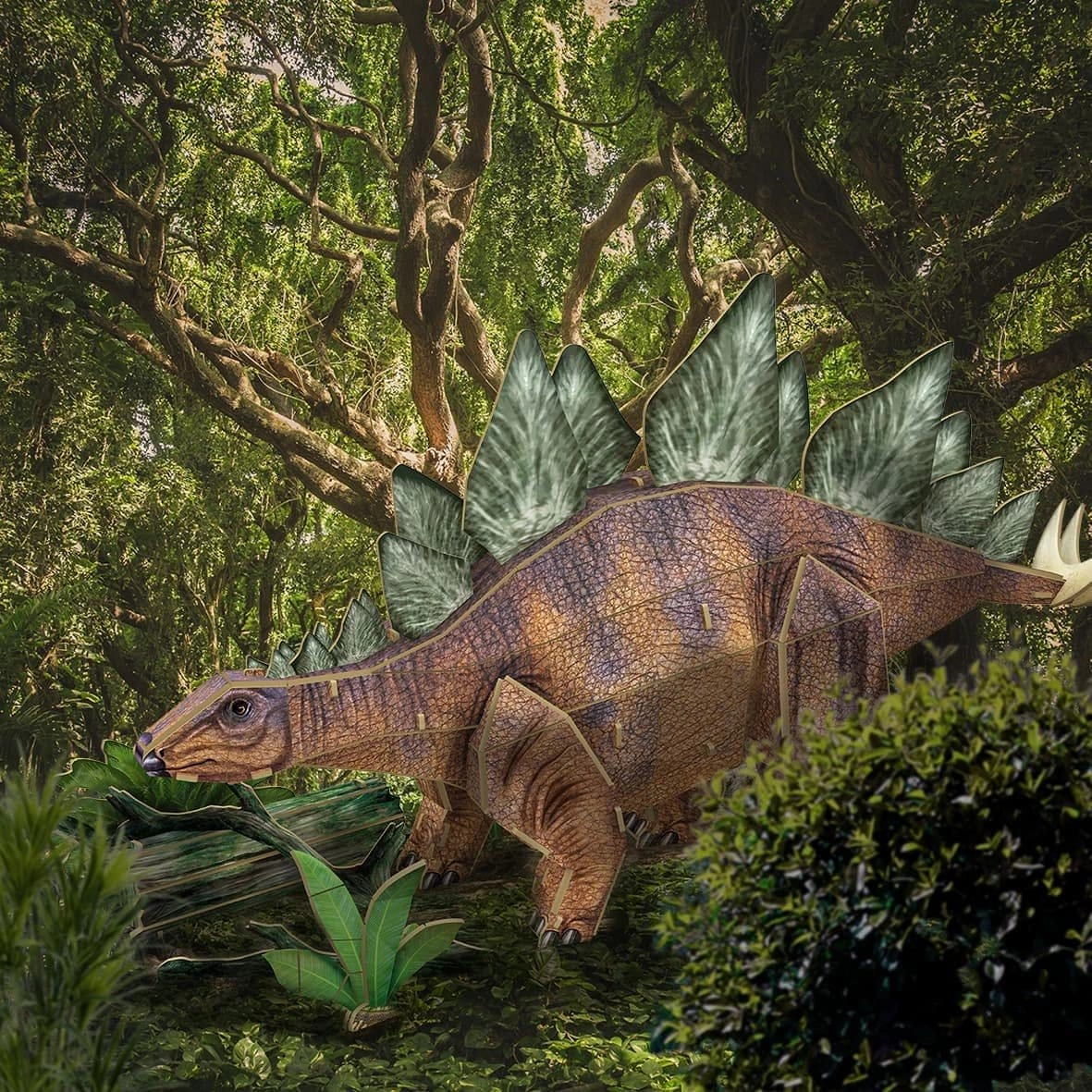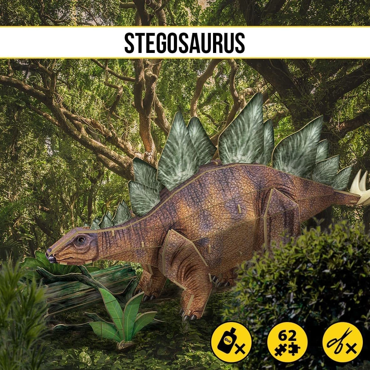 Set di puzzle 3D con dinosauri. Modello di stegosauro composto da 62 pezzi. Questi puzzle 3D di dinosauri sono realizzati in cartoncino pretagliato e schiuma, più sicuri del metallo e del legno, più realistici e leggeri della plastica. Le istruzioni illustrate permettono ai piccoli costruttori di assemblare i modelli in autonomia.