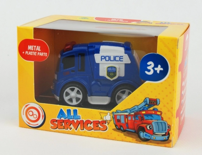 Veicolo in metallo in scatolaAssortimento: camion dei pompieri, auto della polizia, ambulanza, escavatore.