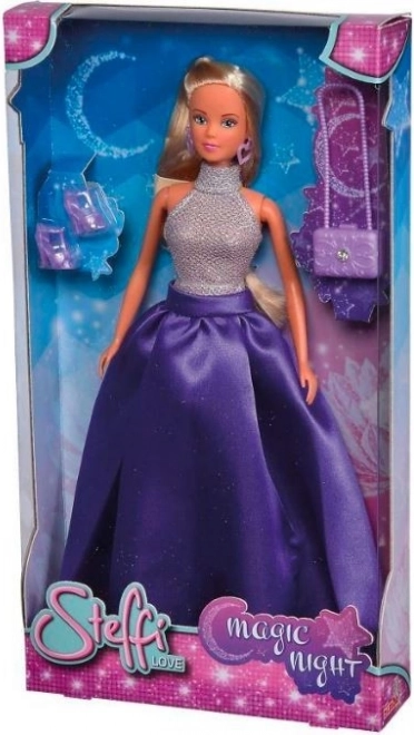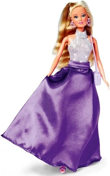 Scopri l'elegante bambola Steffi pronta per una serata magica. L'abito lucente argento‑viola, gli accessori e i lunghi capelli pettinabili la rendono un regalo ideale per i bambini che amano il gioco creativo e gli abbinamenti di moda.