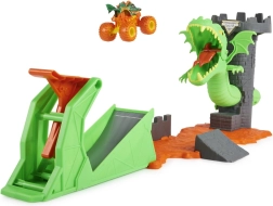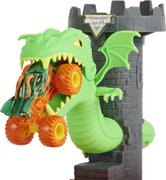 Goditi uno show epico con il set di gioco Monster Jam Dueling Dragon. Carica il truck nel lanciatore, supera la lava e punta alla torre del castello: con un atterraggio preciso abbatterai il drago! Il meccanismo si resetta rapidamente per ripetere l’azione ancora e ancora.