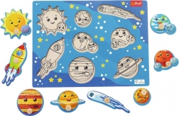 Il puzzle a incastro in legno con tema spaziale è un’ottima scelta per i primi giochi logici. Grazie ai pomelli in legno, i pezzi sono facili da impugnare anche per le manine più piccole e, durante il gioco, i bambini allenano precisione e pazienza. La grafica in bianco e nero nelle cavità riprende l’immagine dei singoli pezzi e ne facilita il corretto posizionamento.