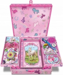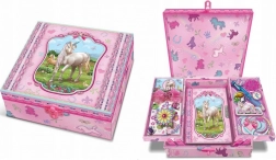 Scoprite organizzazione pratica e design incantato: la scatola decorativa con unicorni, una volta aperta, si dispiega in due scomparti laterali, sotto i quali si nasconde un luogo sicuro per il vostro diario. Ideale per la cameretta dei bambini e come originale contenitore per piccoli oggetti.