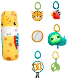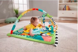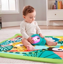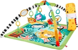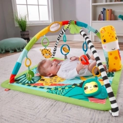 Tappetino da gioco educativo 3 in 1 "Foresta Tropicale" è ideale per bambini dal neonato all'età avanzata. Il morbido tappetino offre uno spazio confortevole per giocare e sei giocattoli appesi stimolano le capacità sensoriali e motorie. Durante il gioco sulla pancia gli archi direzionati possono portare i giocattoli a portata di mano, mentre il cuscino a forma di giraffa offre supporto.