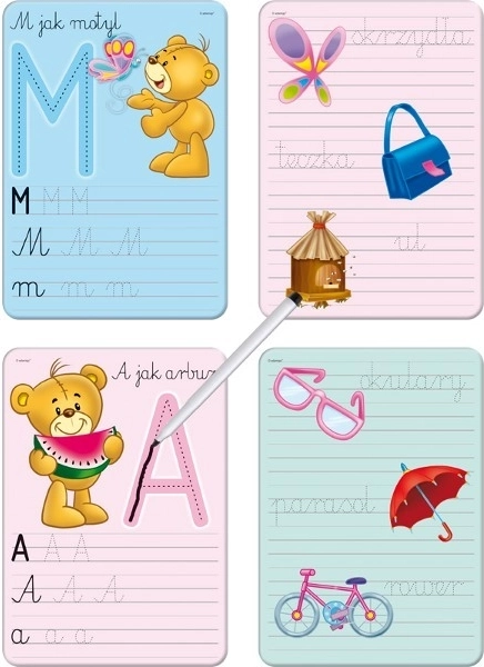 Divertente set didattico con l’orsetto Krzyś che aiuta i bambini ad allenarsi a scrivere le lettere. Grazie al pennarello cancellabile a secco i bambini possono scrivere senza timore: gli errori si eliminano facilmente con un panno e si ricomincia. Ideale per i primi passi nella scrittura, lo sviluppo della motricità fine e la costruzione dell’autostima nell’apprendimento. La superficie cancellabile a secco, il riutilizzo ripetuto e la forma di apprendimento giocosa conquisteranno i bambini.