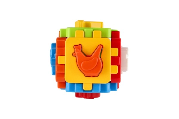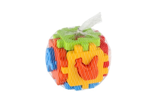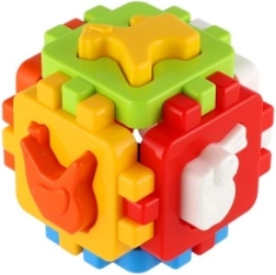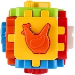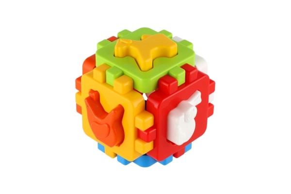 Sei pannelli si uniscono tramite bordi dentellati per formare un cubo solido. Il bambino allena la motricità fine e la pazienza con ripetuti assemblaggi.