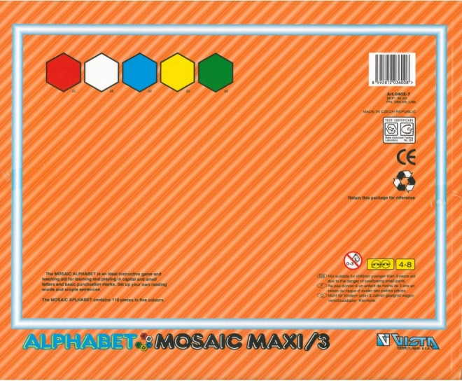 Scoprite il mondo delle lettere con il colorato set Alphabet Mosaic Maxi. Grazie ai pezzi grandi nei colori giallo, rosso, verde, blu e bianco, i bambini si familiarizzano in modo giocoso con l’alfabeto inglese, imparano a comporre parole semplici e sviluppano immaginazione e pazienza.