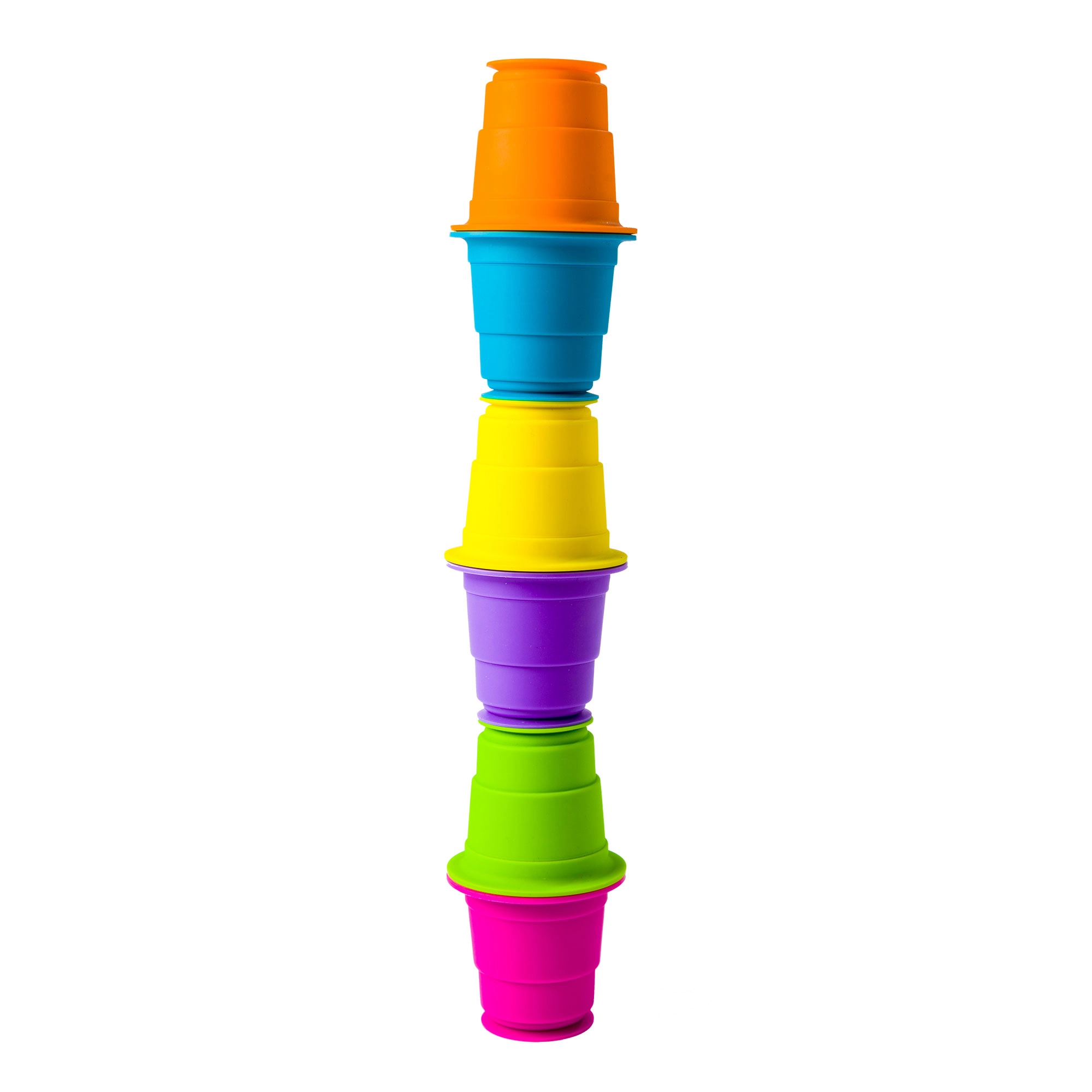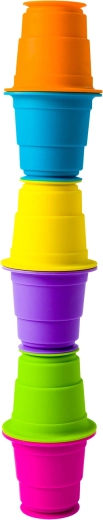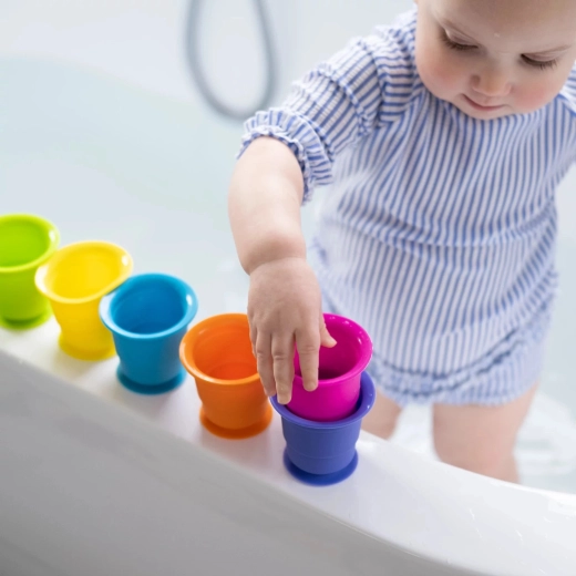 Giocare con i bicchierini favorisce la motricità fine e grossa, le abilità di coordinazione occhio–mano e il riconoscimento dei colori. I bambini possono usarli per travasare l’acqua, ordinare per dimensione e colore o come primi mattoncini da costruzione che crescono con le loro abilità.