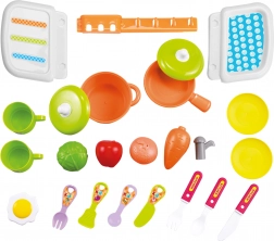 Il set include numerosi accessori che imitano i veri utensili da cucina. I bambini possono “cucinare”, servire e riordinare, favorendo autonomia e pensiero creativo.