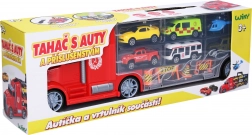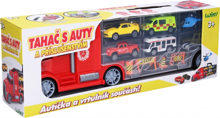 Il set include 5 macchinine e 1 elicottero, così il divertimento può iniziare subito dopo l'apertura. La pratica maniglia estraibile sulla parte superiore del rimorchio facilita il trasporto. Fornito con confezione in lingua ceca.