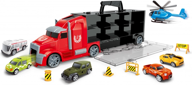 - Contenuto del set: camion con rimorchio, 5 macchinine, 1 elicottero