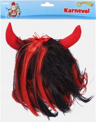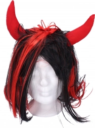 Parrucca diabolica alla moda con capelli neri e ciocche rosse, completata da corna rosse in tessuto. Ideale per San Nicola, balli in maschera e feste a tema. Facile da indossare ed effetto infernale immediato.