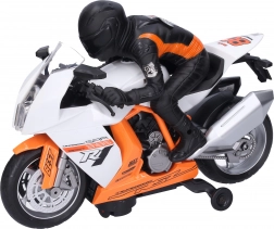 La moto ha una dimensione ideale di 28 cm per una presa e una manipolazione comode. Sono disponibili 2 varianti di colore – arancione e bianco – che spiccano in qualsiasi collezione. L’alimentazione è fornita da 4× AA (batterie non incluse).