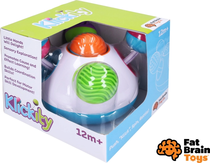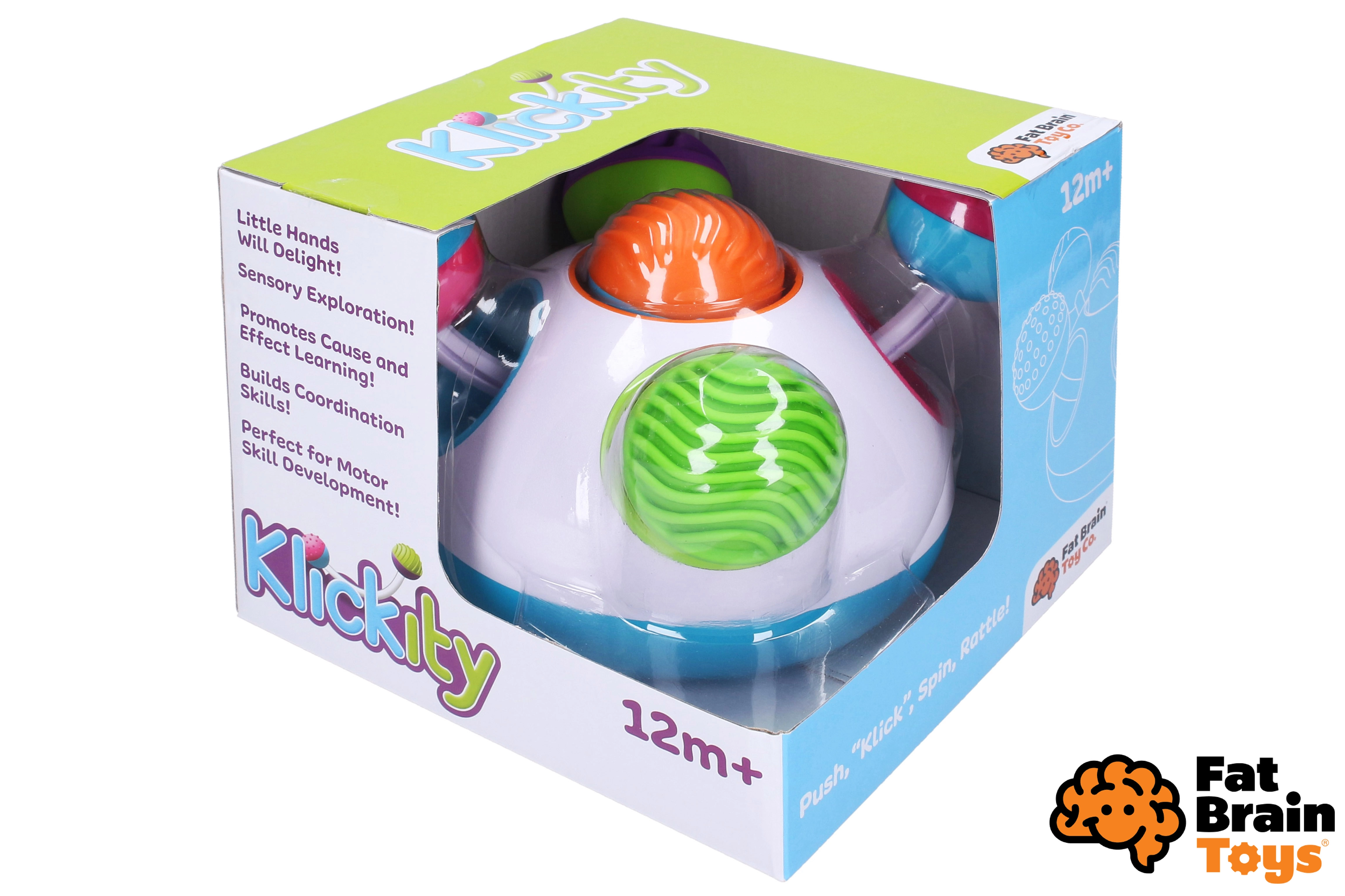 Fat Brain Klickity è un ingegnoso giocattolo motorico che stimola la naturale curiosità dei bambini. La combinazione di colori a contrasto, texture piacevoli e semplici funzioni meccaniche (pressione, spinta, rotazione) offre lunghi minuti di gioco concentrato e sviluppo delle abilità.