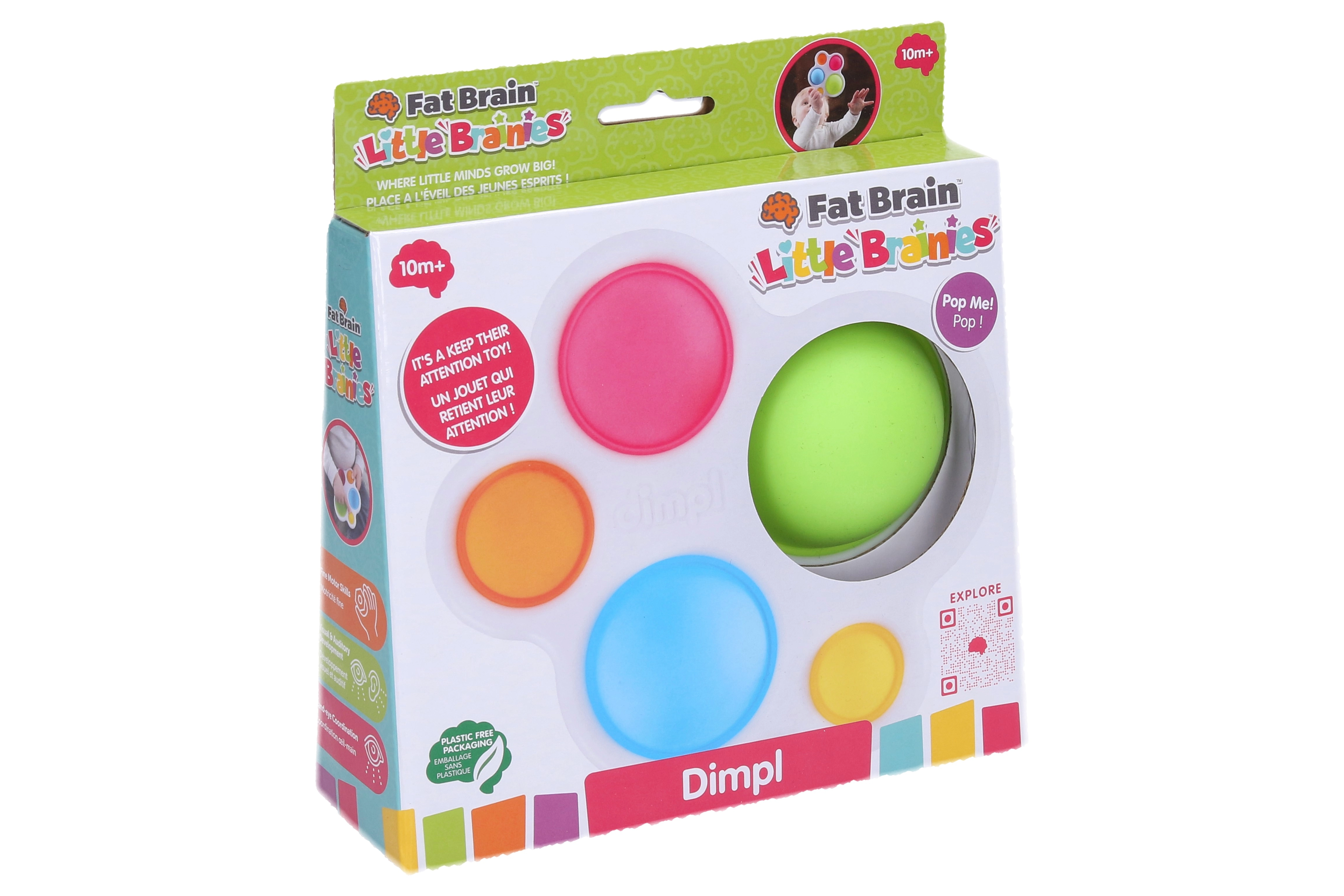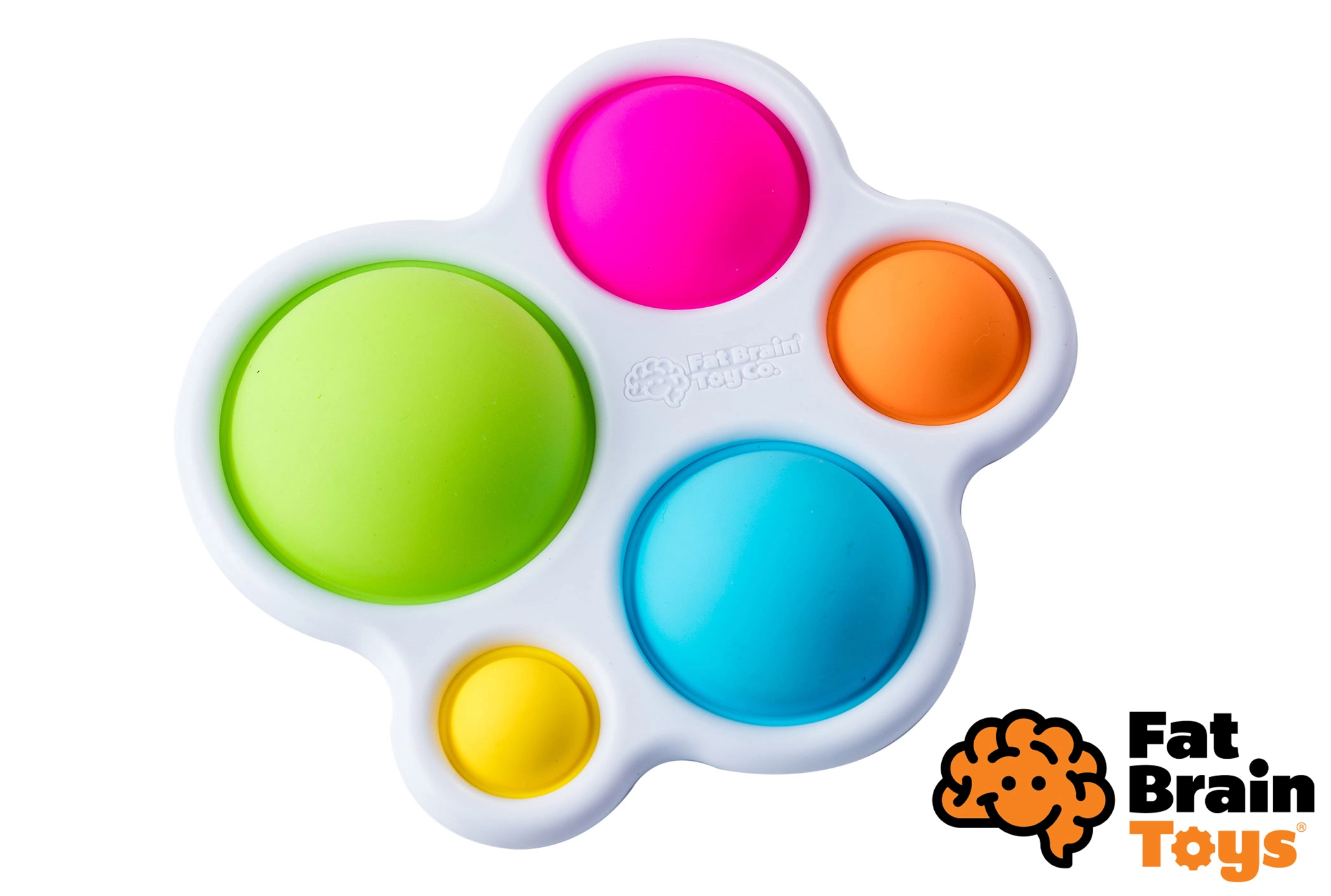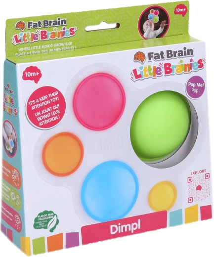 Dimpl di FAT BRAIN è un compatto giocattolo sensoriale con cinque bolle in silicone colorate inserite in un robusto telaio in plastica. Ogni bolla può essere schiacciata e “scoppiettata” da entrambi i lati, catturando subito l’attenzione dei bambini e motivandoli a esplorare ripetutamente.