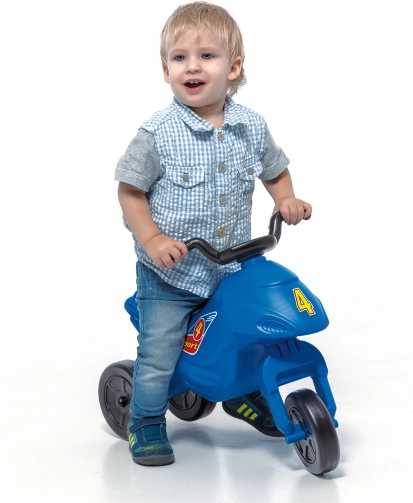 Triciclo senza pedali SUPER BIKE mini di colore blu. Dimensioni 57×28×41 cm, portata 25 kg. Stabile e leggero, ideale per le prime uscite e per sviluppare l'equilibrio.