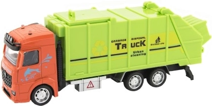 Questo camion dei rifiuti con cabina arancione e corpo verde porta nel gioco elementi di manutenzione urbana.