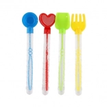 Quattro diverse forme di manico: cerchio, cuore, quadrato e forchetta, nei colori blu, rosso, verde e giallo.