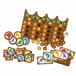 Nella confezione troverete un tabellone di gioco bifacciale, 60 carte dinosauro, carte iniziali, gettoni per la variante base e avanzata, gettoni lava, un gettone leccornia e un regolamento chiaro.