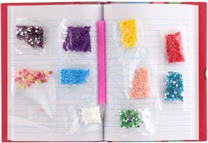 Il set include un blocco da 13x18 cm, un quadratino adesivo, circa 1500 pietrine in dieci colori, un vassoio per smistare le pietrine e una penna speciale per un comodo trasferimento delle pietrine. Il tutto è splendidamente confezionato e pronto per il tuo divertimento creativo immediato.