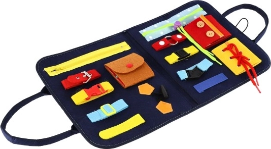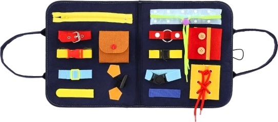 Pratica e divertente tavola motoria in feltro con diverse chiusure che garantisce ai bambini ore di scoperta. Grazie ad attività come cerniere, bottoni, fibbietti e velcro sviluppano la motricità fine, la pazienza e la autonomia nel vestirsi. Ideale in viaggio e a casa, facile da trasportare e resistente.