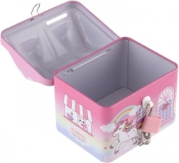 Il salvadanaio è ornato con il tema dell'unicorno e dell'arcobaleno, rendendolo non solo pratico ma anche un bellissimo complemento per la camera dei bambini.