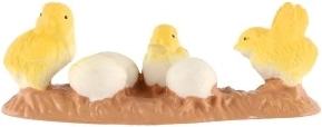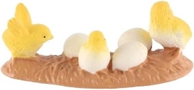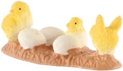 Decora la tua casa con questo bellissimo elemento decorativo in plastica raffigurante pulcini gialli e uova bianche su una base marrone. Questo adorabile accessorio porterà freschezza e incanto primaverile o pasquale nella tua casa.