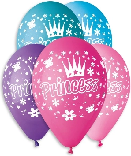 Palloncini gonfiabili in tonalità pastello con motivo di principessa e corona, diametro 30 cm nel set da 5 pz. Decorazione ideale per feste dei bambini, compleanni e party a tema. Adatti dai 3 anni.