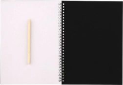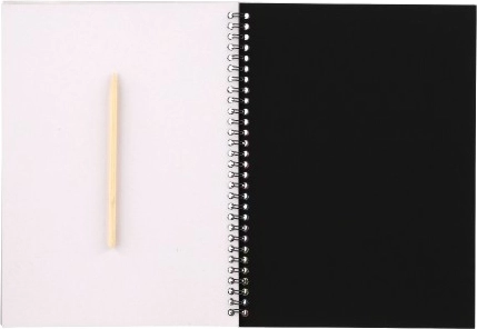 Il taccuino misura circa 19 × 26 cm ed è rilegato a spirale per una sfogliatura comoda. Nella confezione trovi 10 fogli e una bacchetta in legno per graffiare, così puoi iniziare a creare appena lo apri.