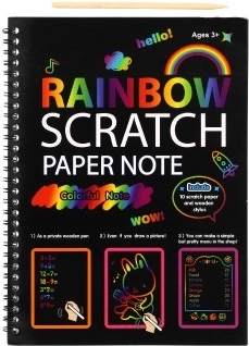 Questo taccuino scratch con fondo arcobaleno offre un modo semplice ma affascinante per creare disegni originali. Sulla superficie nera basta grattare delicatamente e appariranno subito colori arcobaleno brillanti. Ottimo per i piccoli artisti e come attività rilassante per i bambini più grandi.