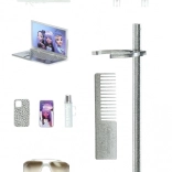 Base trasparente, pettine, grucce, occhiali, telefono con custodia e mini notebook: tutto il necessario per scenette creative e fashion storytelling.