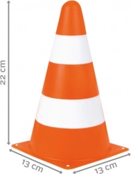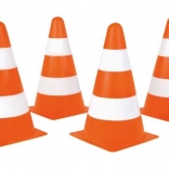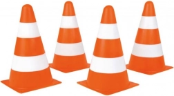 Quattro coni arancioni ideali per giocare con la palla, le macchine giocattolo o come aiuto nei lavori di riparazione. Creare con essi uno spazio per attività sportive o delimitare una zona di sicurezza.